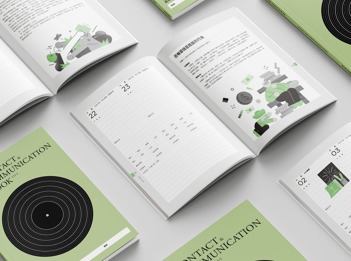 「紙」-每個人進入學習階段所碰觸到的第一個工具,也是陪伴學生從幼稚園到大學畢業最重要的材料之一。本冊聯絡簿封面以仿古紙張作為封面主體,借代「上學」及位於新北市泰山區的「北臺灣第一間書院 — 明志書院」。