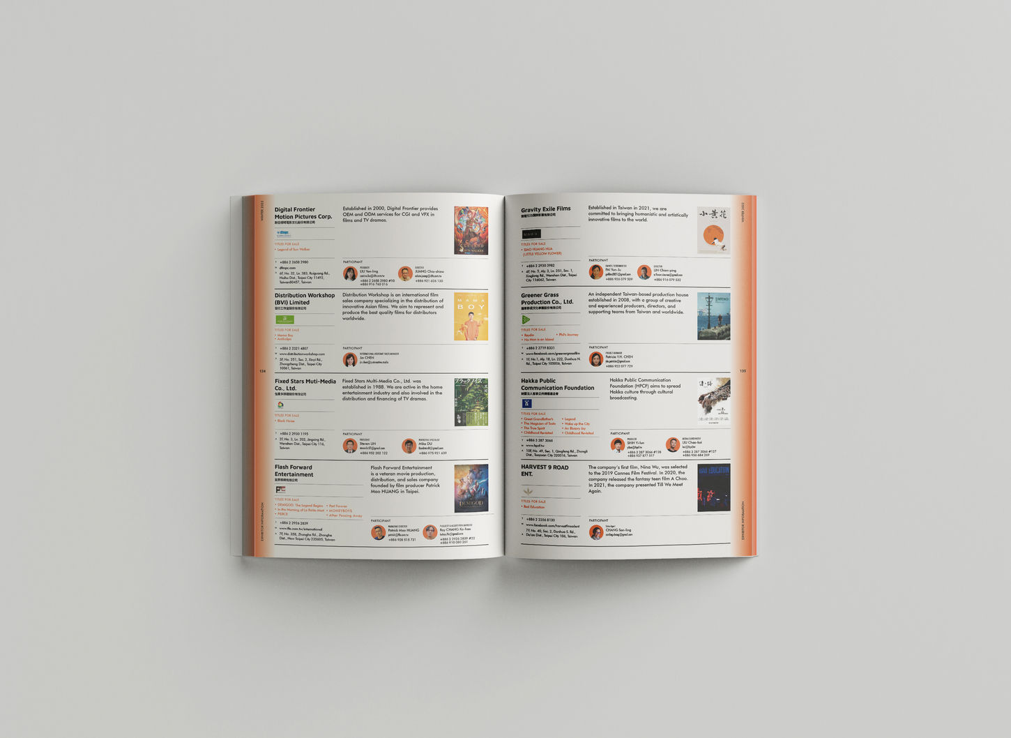2022年底收到文策院的委託,進行「2022_釜山影展市場展單元:亞洲內容暨電影市場展 ACFM」的系列手冊視覺編排,此系列手冊包含電視及電影兩冊,設計內容則包含封面視覺設計及內頁編排。手冊封面及內頁的顏色延伸自文策院品牌色,並以漸層的方式呈現於內頁頁面側緣,隨著不同影視作品的類別變化。除了區分作品類別外,也加深觀展者對台灣文化內容策進院及台灣影視作品的印象。