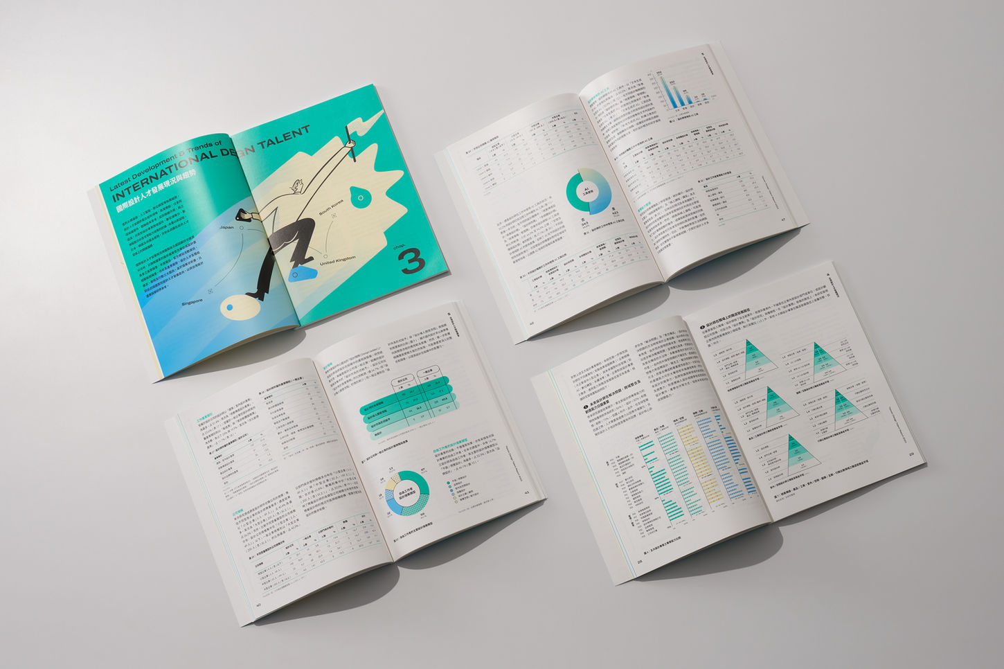 手冊圍繞「調查研究、前瞻、跨域、專業」等四大核心概念進行設計,封面以漸變多邊形搭配線條,表現專業感及現代感。章節頁以插畫呈現各主題,增加趣味性並引導閱讀。內頁延續封面色彩及版面設計,清晰呈現調查結果與數據趨勢,讓讀者更易理解。