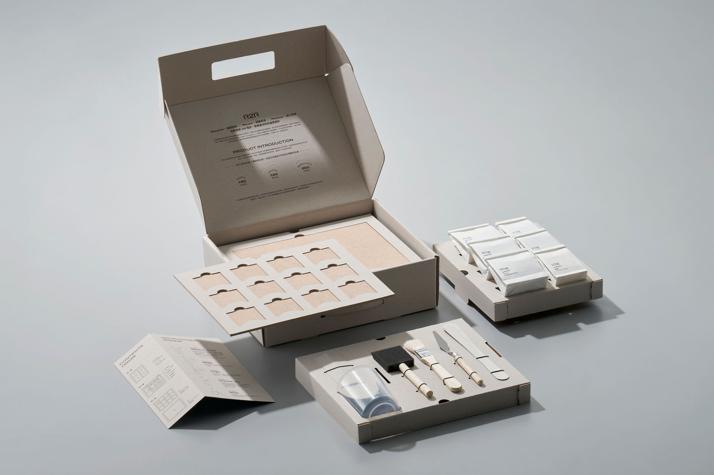 為讓循環塗料更方便地被使用與推廣,R2R塗料工具盒因應而生。這款工具盒設計目標是便於攜帶、收納、使用與展示。外盒視覺設計萃取三種石材紋路,以單色燙黑呈現,減少印刷工法呼應環保概念。
